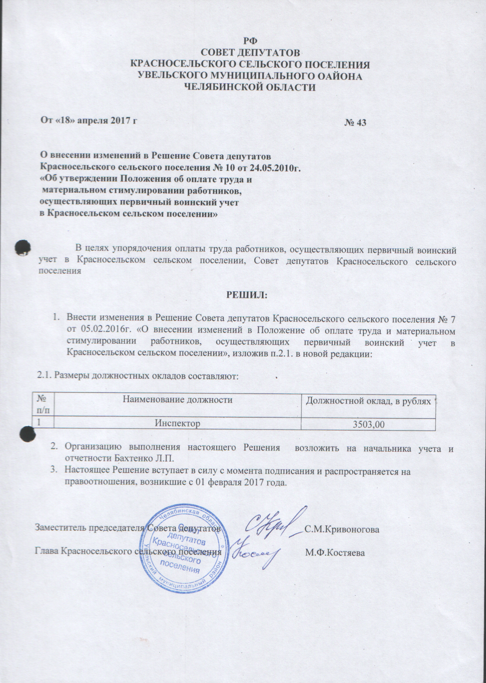 Решение № 43 от 18.04.2017 года «О внесении изменений в Решение Совета депутатов Красносельского сельского поселения № 10 от 24.05.2010г. « Об утверждении Положения об оплате труда и материальном стимулировании работников, осуществляющих первичный воински